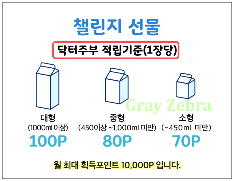 소형, 중형, 대형 사이즈 별로 포인트가 틀리고 종이팩을 최소 50매까지 닥터 주부에 보내시면 돼요.