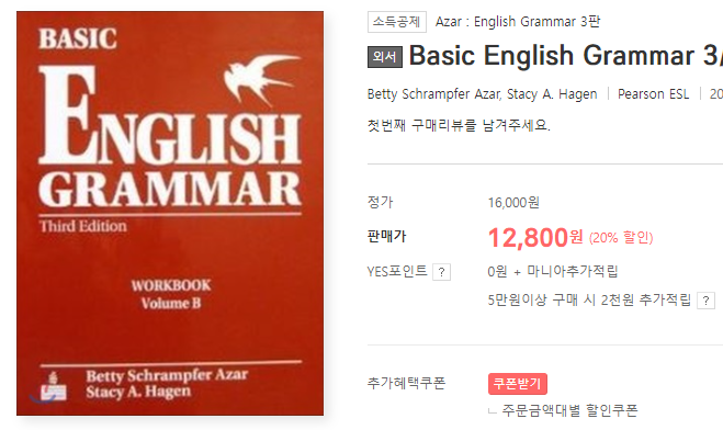 grammar 도 한국인이 한글로 쓴 영어 문법 책도 도움이 되지만 Azar 같은 책도 정말 도움이 많이 돼요.